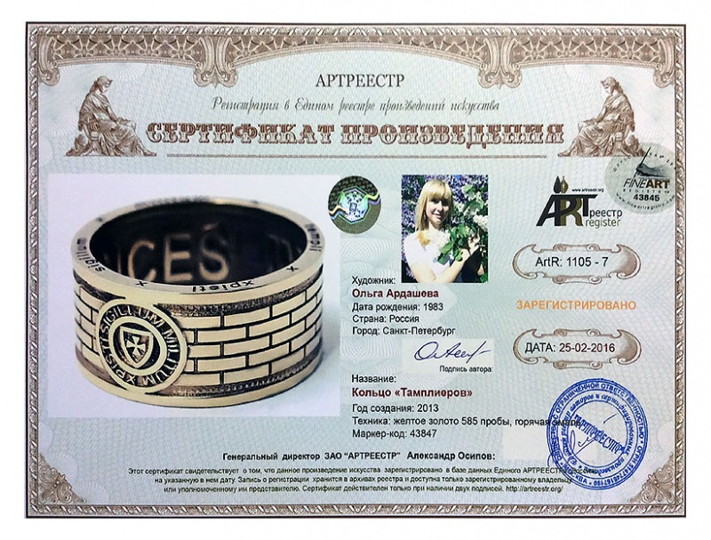 0 0 0 0 0   Online система регистрации арт-объектов artreestrСертификаты произведений членов «АРТ реестра»Ардашева Ольга Викторовна"Кольцо Тамплиеров"