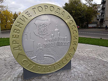 В городе Старая Русса есть памятник монете номиналом 10 рублей. Он был изготовлен в северной столице России. Эта серия монет посвящена древним русским городам. В частности, памятник посвящен монете с изображением Старой Руссы.