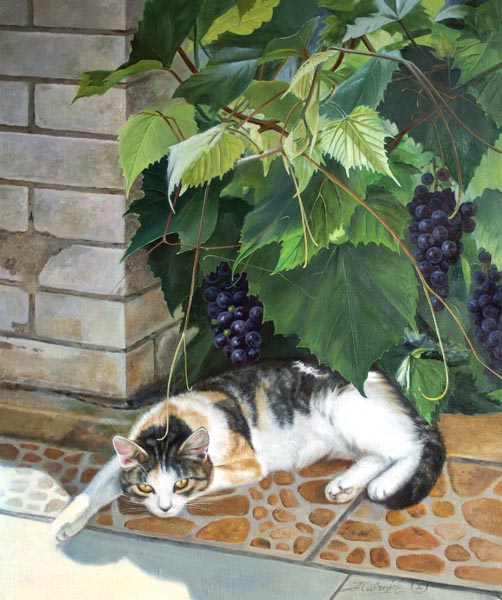 Online система регистрации арт-объектов artreestr ≈ Галерея картин не членов Реестра ≈ Савченко Алёна Анатольевна ≈ "Кошка Дашка, задремавшая в тени винограда, разбуженная внезапным вторжением"