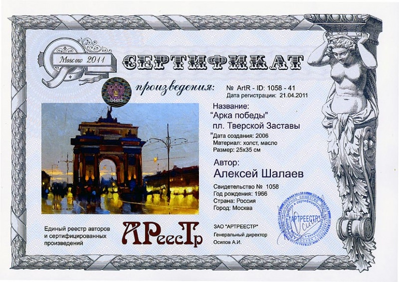 0 0 0 0 0   Online система регистрации арт-объектов artreestrСертификаты произведений членов «АРТ реестра»Шалаев Алексей Евгеньевич"Арка победы" пл. Тверской Заставы