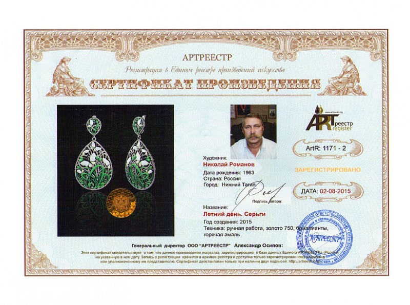 0 0 0 0 0   Online система регистрации арт-объектов artreestrСертификаты произведений членов «АРТ реестра»Романов Николай Александрович"Летний день. Серьги